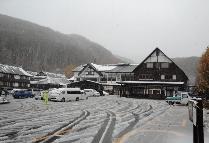 8時10分東京駅に集合。8時40分発、東北新幹線、はやぶさ7号で11時51分に新青森駅に着く。バスで八甲田山に行き、ロープウェイに乗って紅葉を楽しむ計画であった。ところがロープウェイは、強風のため運行停止となる。八甲田山南側の山岳道路を経て、三沢方向のホテルに向かう予定であったが、12時過ぎに八甲田山中腹にある酸ヶ湯温泉街に着くと急に雪が降りだし、あっという間に道路は真白になった。バスにチェーンの準備がないため引返して、一般道を通って三沢市の古牧温泉にある「星野リゾート青森屋」へ向かった。16時30分にホテルに着く。