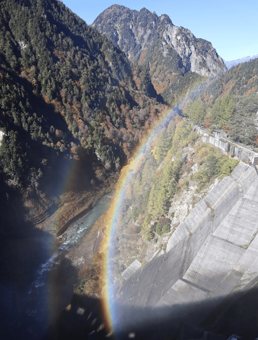 7時30分に出発。大町アルペンラインを走り、8時10分に扇沢駐車場(標高1433M)に着く。8時30分、扇沢で関電トンネル電気バスに乗り、トンネルをくぐり、8時46分に黒部ダム(標高1470M)に着く。黒部湖畔の紅葉が見ごろであった。ダムからの放水でできる虹が奇麗だった。ダム見学広場にダム建設で殉職された人の慰霊の像がある。