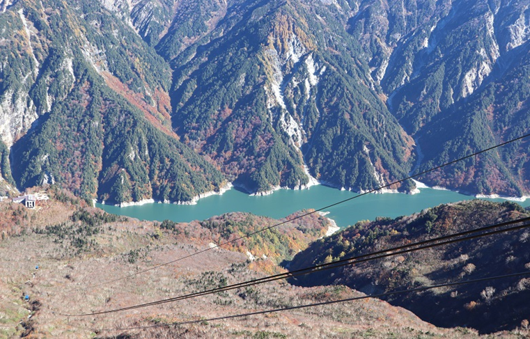 ダム上の道路を歩いて黒部湖ケ-ブルカー乗り場に行く。ケーブルカーで5分の後、黒部平(標高1828M)に着く。次いでロープウェイに乗り換え、7分で大観峰(標高2316M)に着く。