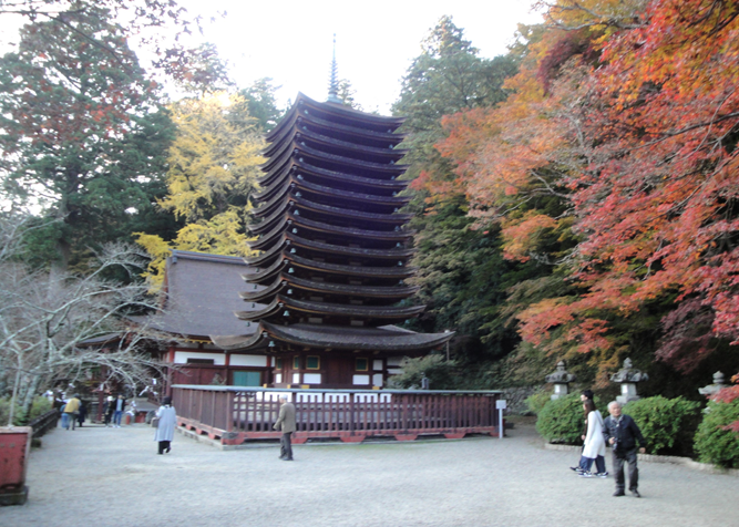 東京発10時の新幹線のぞみで12時17分に京都駅に着く。JR奈良線に乗り換えて、14時に奈良駅に着く。駅近くでレンタカーを借り、上街道を25キロほど南に走り、15時に桜井市にある談山神社に着く。1時間ほど境内を散策する。ここは1997年11月に奈良・伊勢志摩へのドライブ旅行で訪ねた時、紅葉の素晴らしさに感激し、いつかまた来てみたいと思っていた所。今回の紅葉は、台風の影響か、葉が傷んでおり、期待はずれであった。談山神社の主祭神は藤原鎌足公で、談山の名の由来は、中臣鎌足と中大兄皇子が、大化元年(645年)5月に大化の改新の談合をこの多武峰にて行い、後に「談い山(かたらいやま)」「談所ヶ森」と呼んだことによるとされている。16時に出て、17時に「奈良ホテル」に着く。