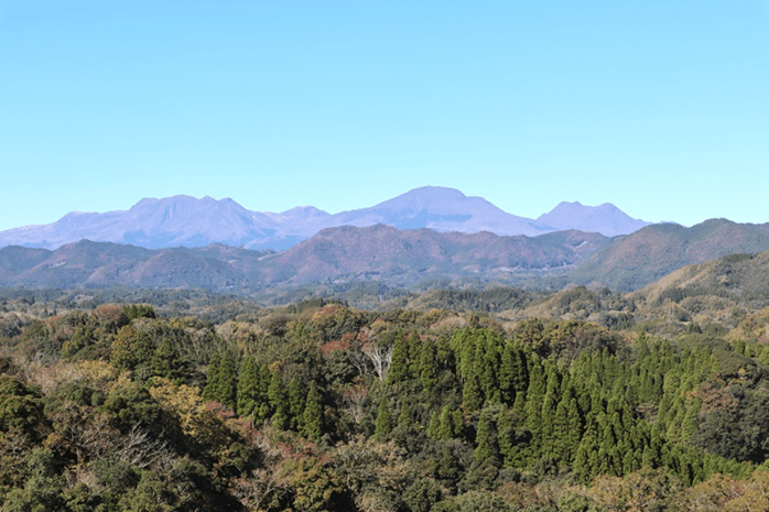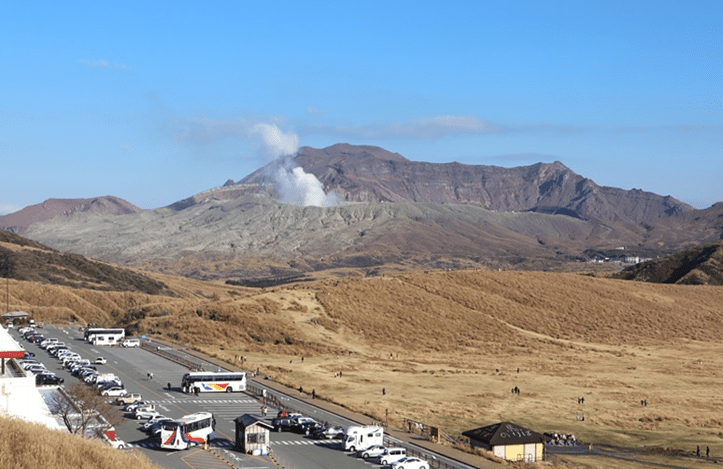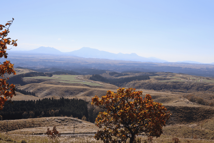 12時40分に出て日田往還を走り、久住高原ロードパークを経て、14時に阿蘇市の城山展望所に着く。阿蘇連山を遠くに見て広がる緑の平原が印象的であった。