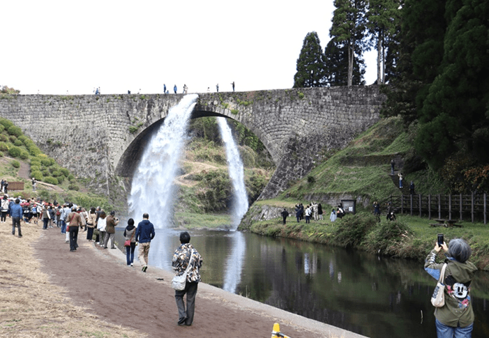 11時40分に出て国道218号線を西に走り、13時10分に昨年(2023年9月)国宝に指定された通潤橋に着く。通潤橋は、四方を谷で隔てられ水源に乏しい白糸台地をうるおすために造られた近世最大級の石造アーチ型水路橋で、嘉永7年(1854年)に完成。ここは1964年(昭和39年)秋、久留米市にある陸自幹部候補生学校の学生の時、大矢野原演習場で実施された野外訓練の際に見学しことがある。