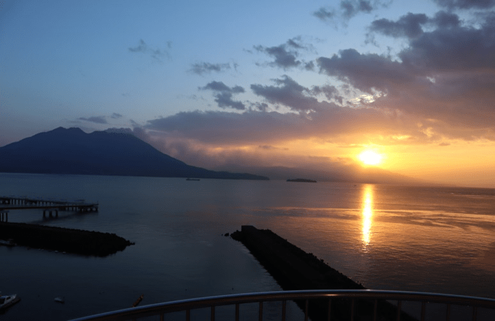 6時半に起きて窓のカーテンを開けると、桜島の右側に日の出がきれいに見えた。写真に収める。