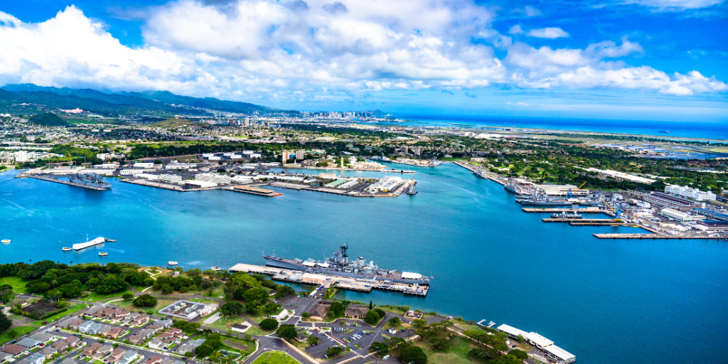 | 真珠湾(手前中央は戦艦ミズーリ艦、左にあるのがアリゾナ記念館) |