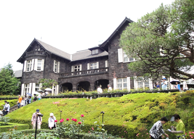 このところ暑い日が続いていたが、前日の天気予報では、終日曇りだったので、出かけることにした。午前10時頃、JR飯田橋駅で総武線から地下鉄南北線に乗り換え、西ヶ原駅で下車。本郷通りを7分ほど歩いて、都立古河庭園に着いた。黒塗りの英国風の邸宅の前庭には多くのバラが咲き誇っていた。坂になっている遊歩道を降りると日本庭園となっており、池には鯉や亀が泳いでいた。入場客は、60、70代のオジ・オバさんが多く、バスツアーの客も見かけた。