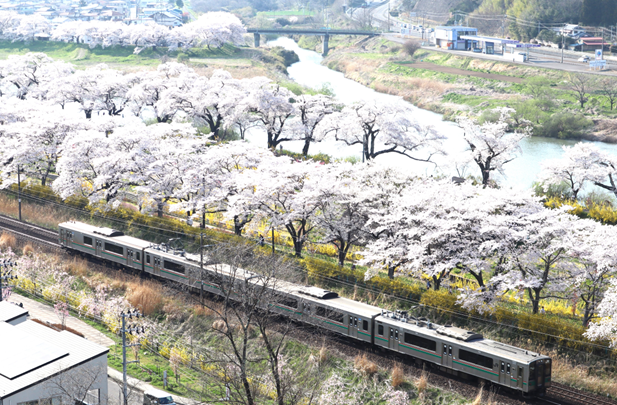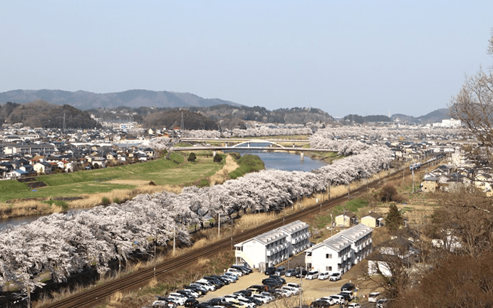 | 白石川千本桜(船岡城址公園からの眺め、電車は東北本線) |