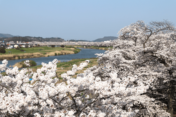 | 白石川千本桜(遠方高台が船岡城址公園) |
