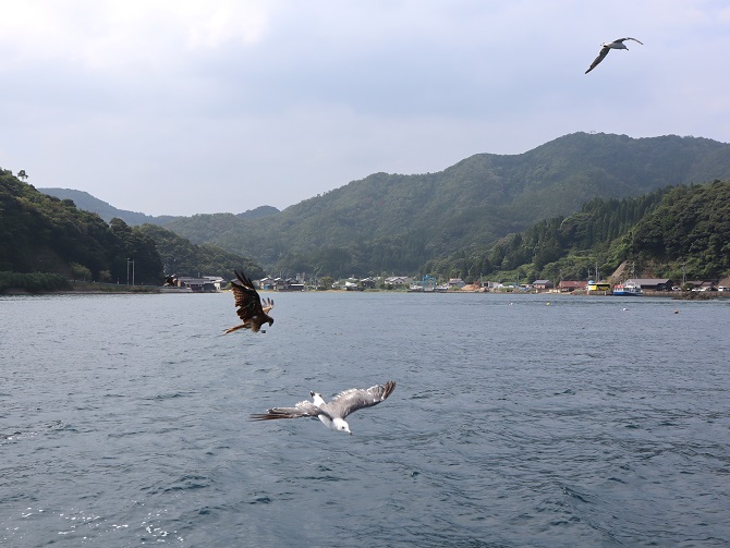 次いで10キロほど北にある伊根の舟屋に行く。遊覧船に乗って伊根浦沿いの海面すれすれに立ち並ぶ船倉兼民家の風景を見て回る。1階に船の収納庫、上階に住居を備えた、この地区独特の伝統的建造物である。遊覧船の廻りには、カモメが次々に飛来し観光客が与える餌をついばんでいた。15時半にバスに乗り、17時半に京都駅に戻った。途中、高速道から眺める丹波地方ののどかな田園風景は印象的だった。