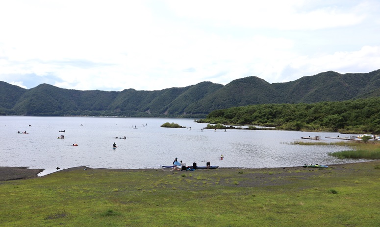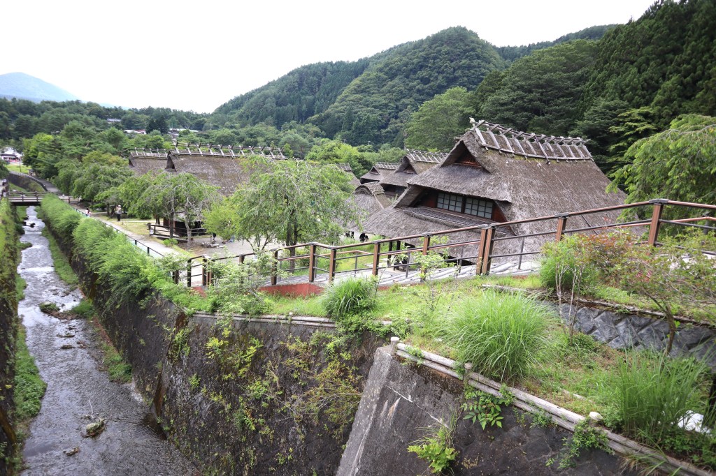 11時50分に西湖に着く。西湖の奥の山沿いに「いやしの里根場」がある。藁ぶき屋根の村落で日本の原風景が保存されている。30分ほど散策。