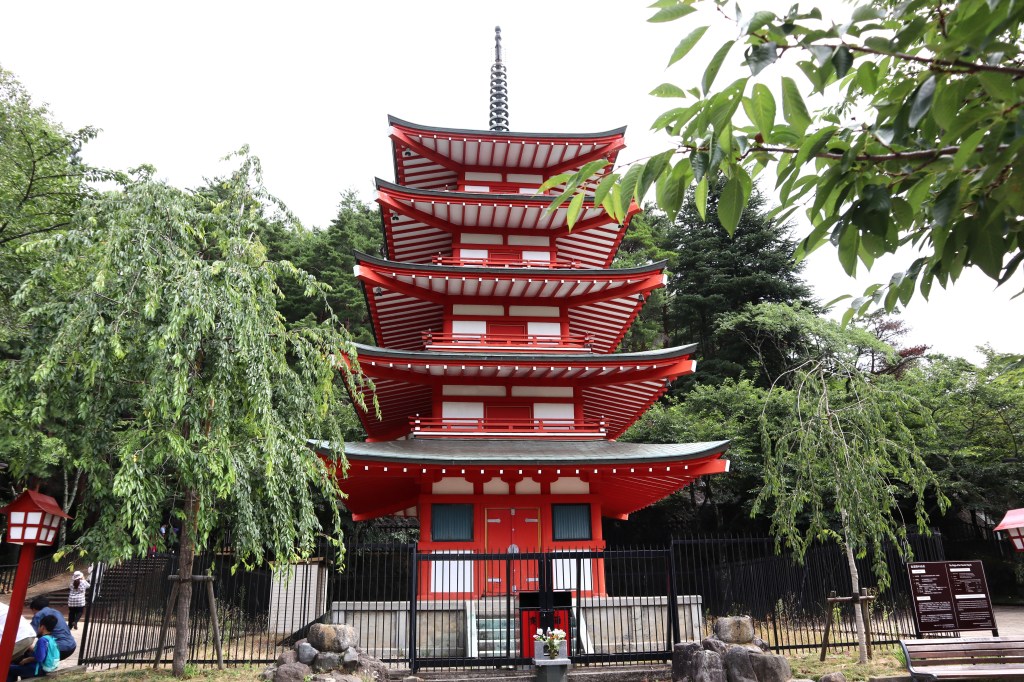 2024年8月1、2日、静岡県富士市にあるトーヨーカラー(株)富士製造所で出張講習があったので、前日を利用し、富士山周辺のドライブをした。7月31日、朝6時に家を出て中央自動車道を走り富士吉田ICで降り、9時に富士吉田市にある新倉山浅間公園の駐車場に着く。公園の急な坂道を登り忠霊塔(五重塔)のある広場に着く。ここから五重塔越しに望む富士山の景色は、日本を象徴する絶景として広く世界中に知られている。