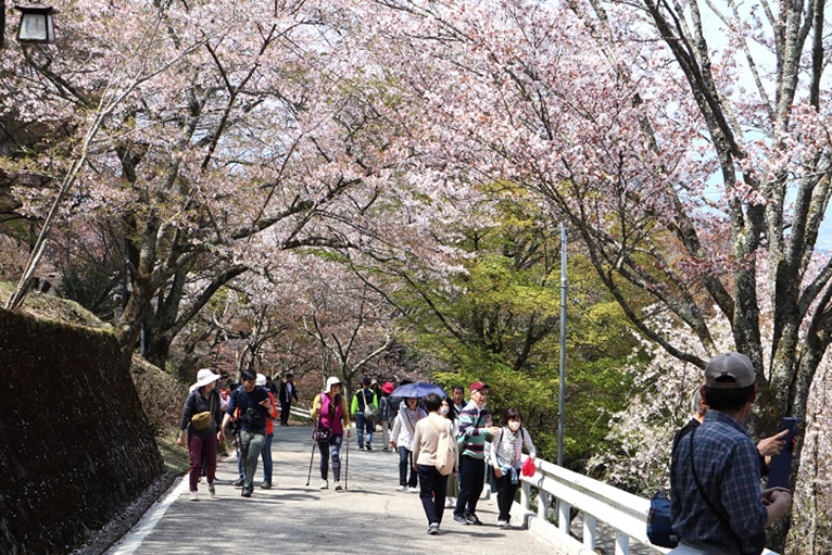 奥千本を観るためマイクロバスに乗り、約10分、吉野水分神社付近で下車。奥千本のある西行庵まで2キロの小道を歩く。10時に引き返すバスに乗り、竹林院近くに戻る。小休止の後、吉野山の全景が見える花矢倉展望台まで1キロの坂道を歩く。道路は、花見客であふれていた。展望台から眼下に一望する吉野山の全景は、絶景であった。